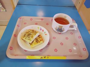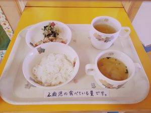 今日のお昼は ごはん・田舎煮・ほうれん草のお浸し・玉ねぎの味噌汁