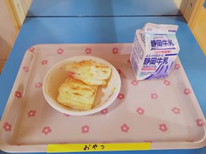 今日のお昼は 食パン・まぐろのフライ・キャベツの胡麻マヨネーズ和え・野菜のスープ
