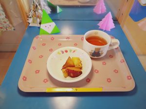 今日のお昼は ごはん・豆腐のきのこあんかけ・小松菜のお浸し・油揚げのみそ汁