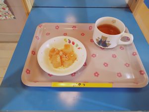 今日のお昼は ごはん・マグロのケチャップ和え・ほうれん草とお麩の胡麻和え・豆腐のみそ汁