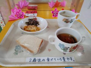 今日のお昼は 食パン・かぼちゃグラタン・キャベツのゆかり和え・春雨スープ