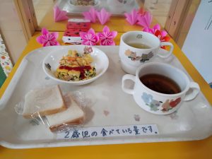 今日のお昼は 食パン・野菜のキッシュ・マカロニサラダ・しいたけのスープ