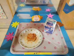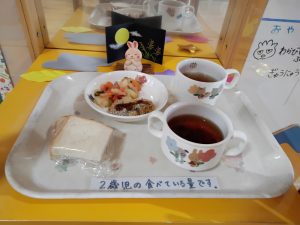 今日のお昼は 食パン・はんぺんフライ・マセドアンサラダ・春雨スープ