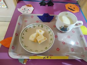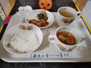 今日のお昼は ごはん・鶏肉の竜田揚げ・小松菜のお浸し・けんちん汁