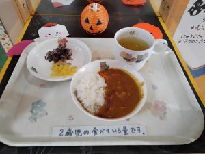 今日のお昼は 秋のカレーライス・キャベツのゆかりあえ・福神漬(乳児…たくあん)