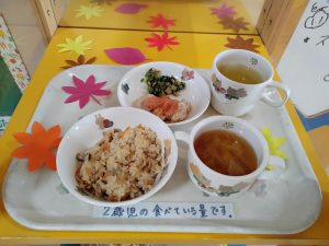 今日のお昼は ごはん・鶏肉のオーロラソース・小松菜のお浸し・大根のみそ汁
