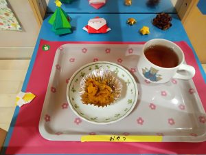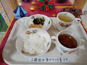 今日のお昼は ごはん・のし鶏・ほうれん草のごま和え・しめじのスープ