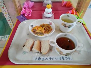 おやつは マカロニのトマト煮・麦茶