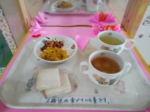 今日のお昼は 食パン・かぼちゃグラタン・キャベツの胡麻和え・サンラータン