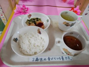 和田母子福祉会 さくら保育園 > 今日の献立 > 今日のお昼は ごはん・ミートローフ・小松菜のお浸し・和風野菜スープ