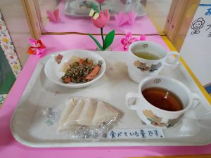 今日のお昼は 食パン・鮭の香りフライ・マセドアンサラダ・しめじのスープ