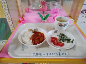 今日のお昼は ハヤシライス・きゅうりとわかめの酢の物・ミニトマト・ひとくちゼリー