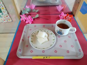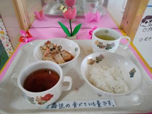 今日のお昼は ごはん・まぐろの竜田揚げ・ツナサラダ・えのきのスープ