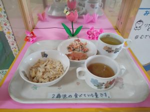 今日のお昼は たけのこごはん・鶏肉のオーロラソース・ゆたか和え・わかめのみそ汁